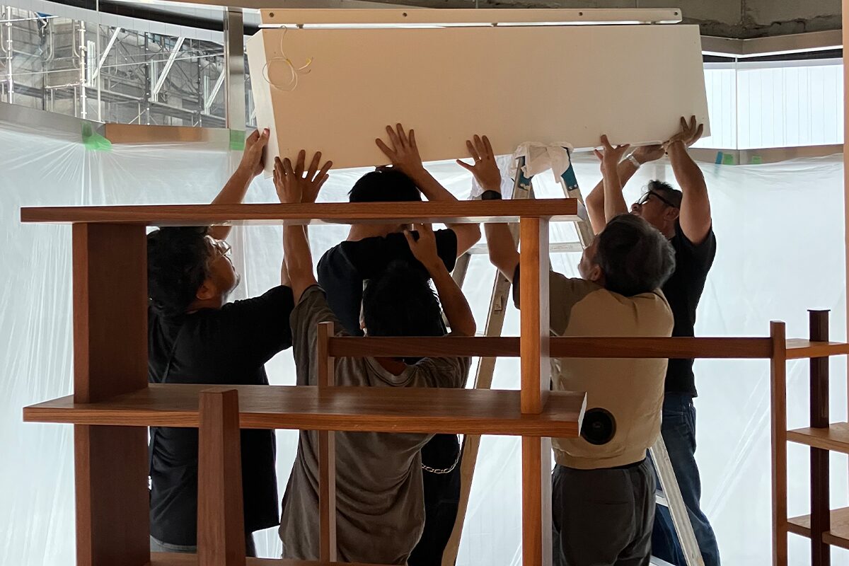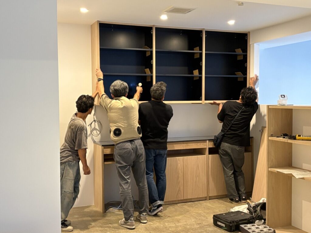 岡山本社から設計施工チームも駆けつけ、造作家具や照明の取付など、最終調整の段階へ。