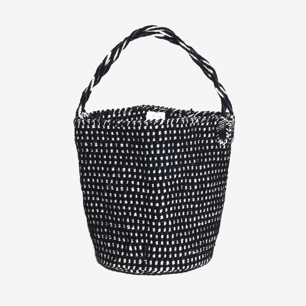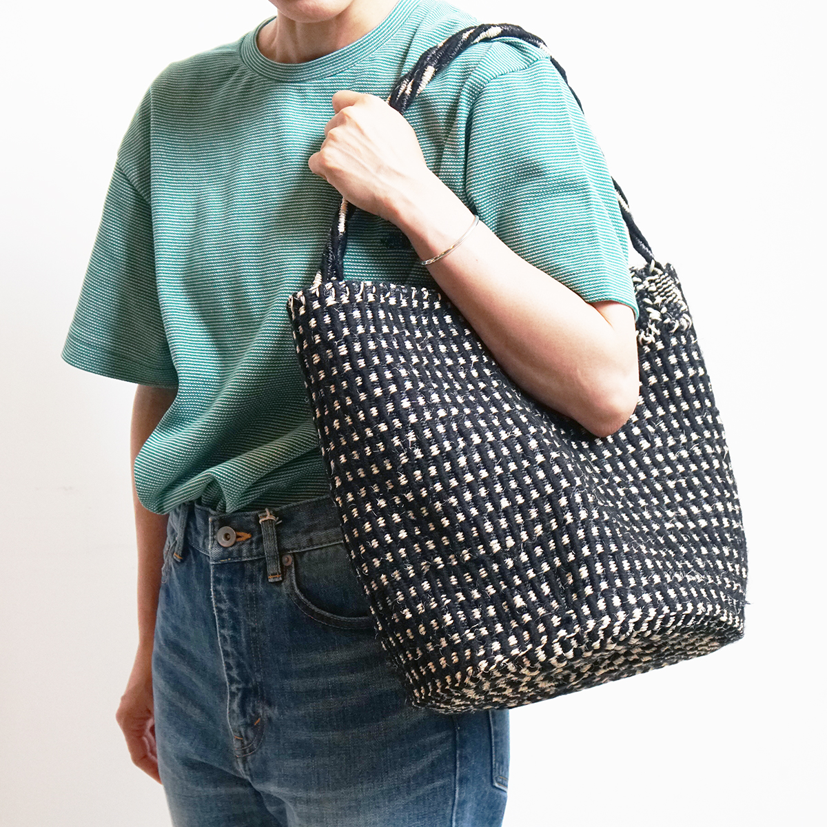 ギンガムチェックの柄が目を引くバスケット。肩に掛けられるようになっています。コーディネートのポイントにおススメです。