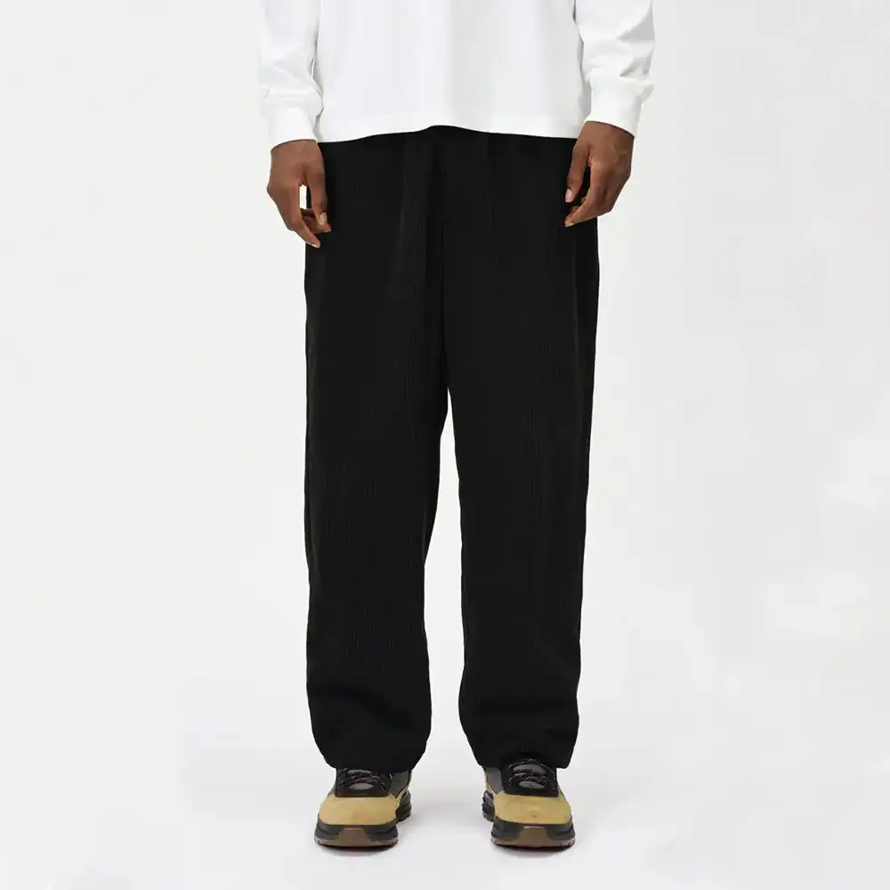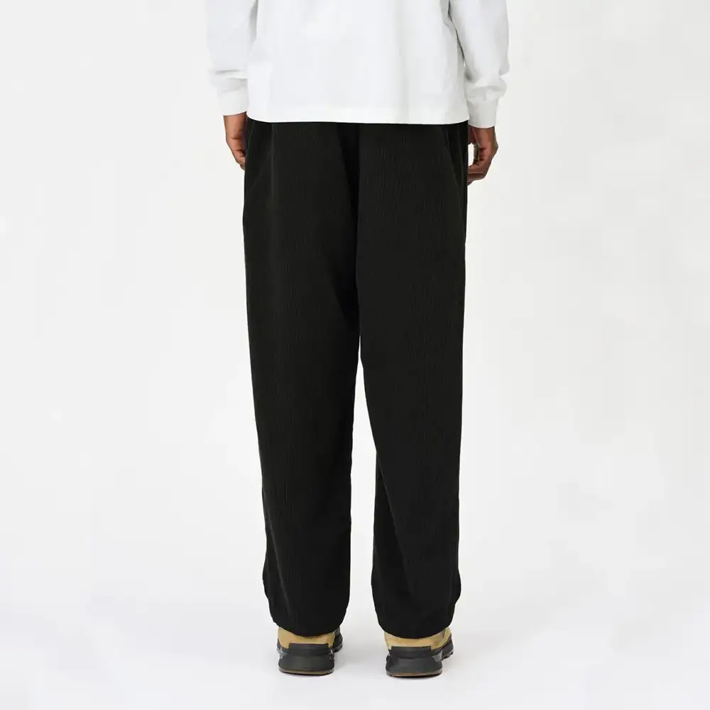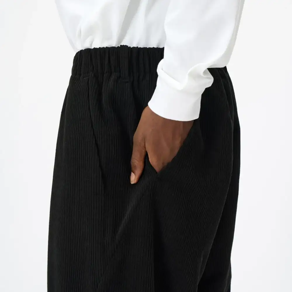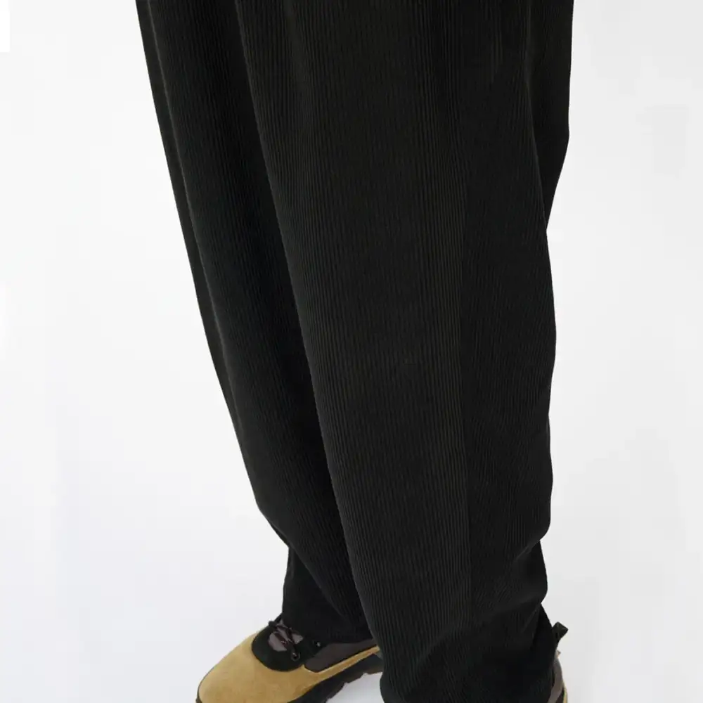 やや太めの畝の7Wコーデュロイを使用しており、カジュアルにもきれいめにも着られます。素材はポリエステル100%で、シワになりにくいのも特長です。ややゆったりとしたストレートシルエット。リラックス感のあるシルエットに仕上げることで、快適性を高めました。