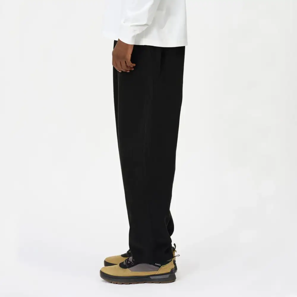 ウエストはゴム+スピンドルのイージー仕様で、ベルトループも配しています。腰ポケット内側には、セキュリティポケットを配置。環境への負荷に配慮して、素材の一部にリサイクル糸を使用しています。