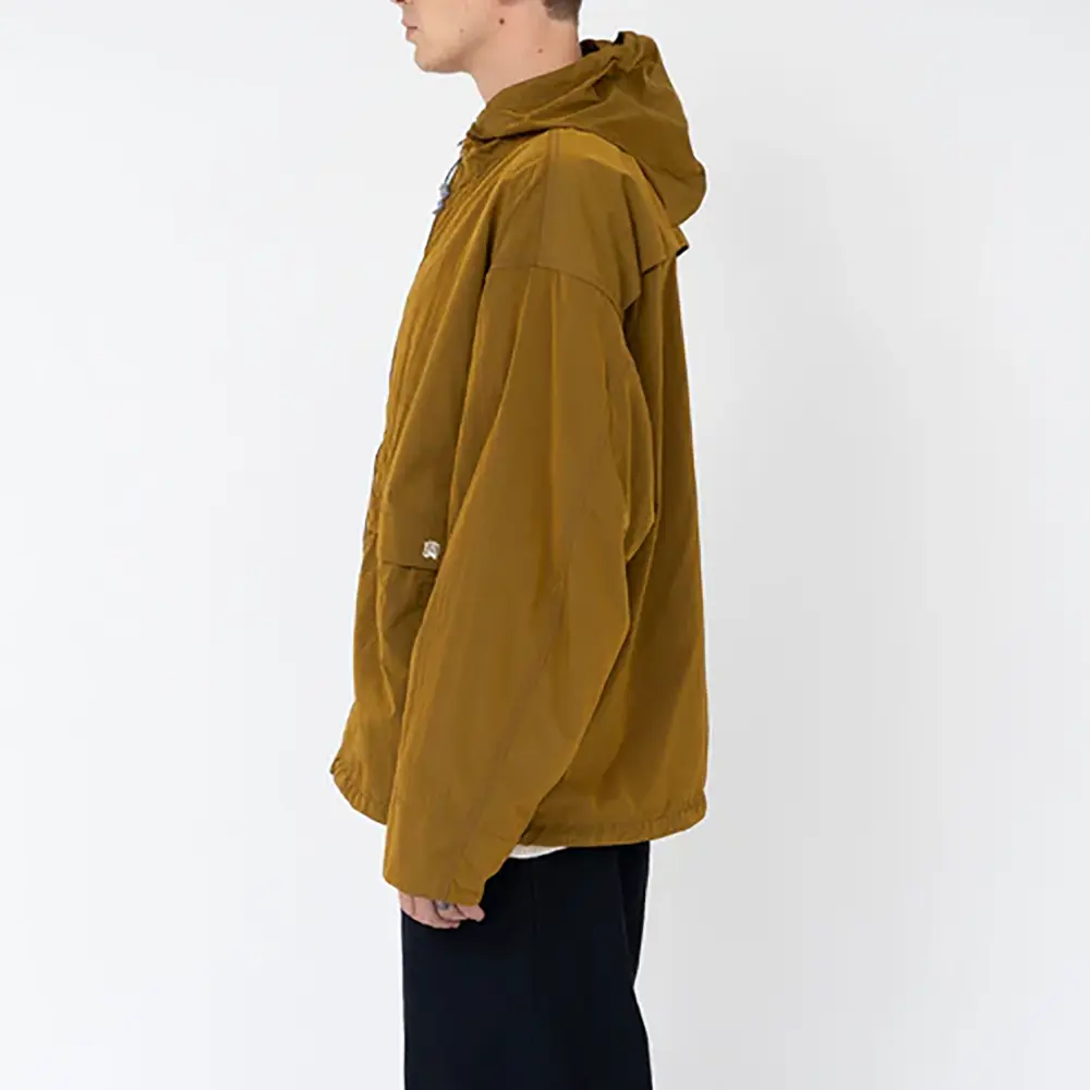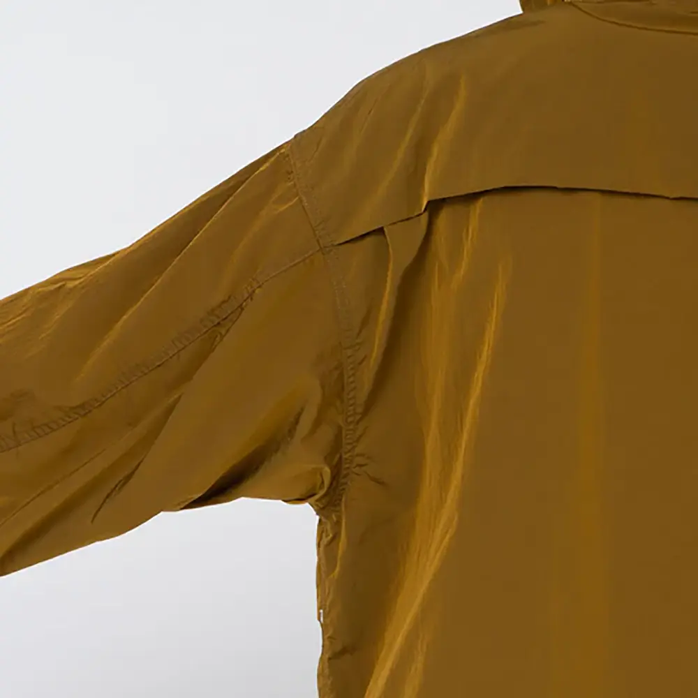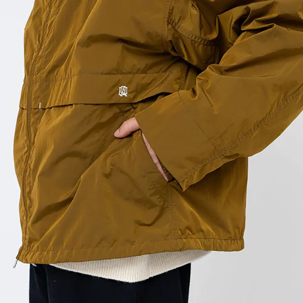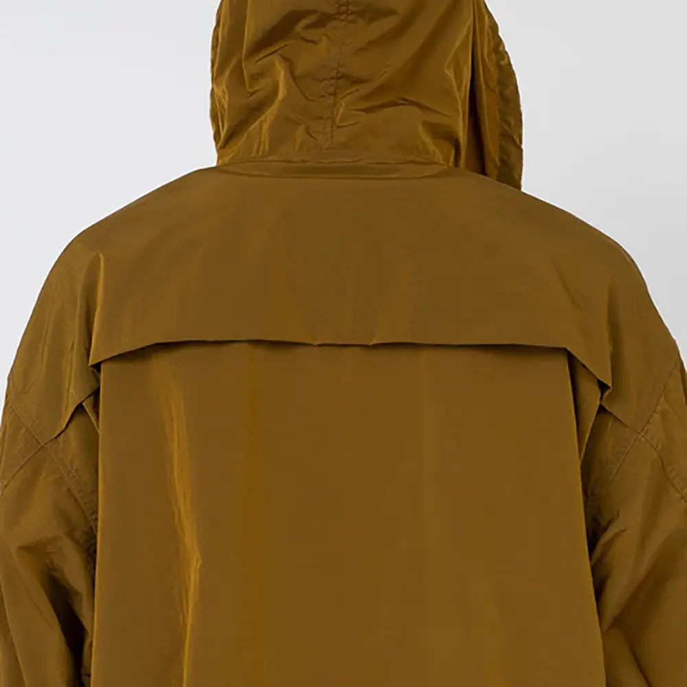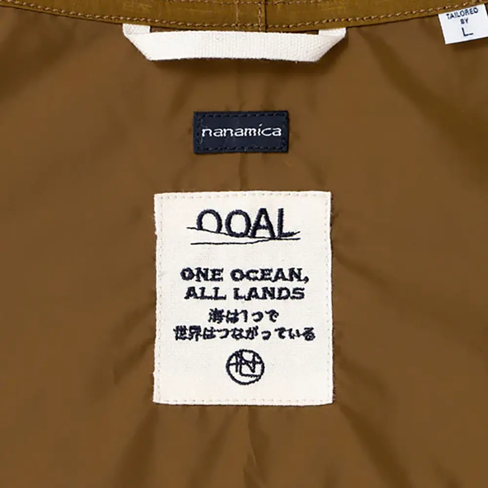 経糸をベースカラー、緯糸をブラックにすることで色の陰影が生まれ立体的に見えるのが特徴です。表面には、環境に配慮した非フッ素系のはっ水加工。クラシックなセーリングパーカーをベースにしたウィンドブレーカー。OOALモノグラム刺繍入り。