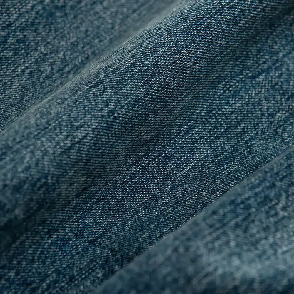 生地には、旧式の力織機(シャトル織機)で丁寧に織り上げたセルビッチデニムを採用しています。生地のタテ糸には、インディゴロープ染色した程よいムラ形状の中白糸を使用。加工は「FIVE Year」仕様で、中濃色のエイジングを施し、約5年間穿き込んだかのような風合いを表現しました。全体的に色落ちした色味とハードなアタリ感が特徴です。