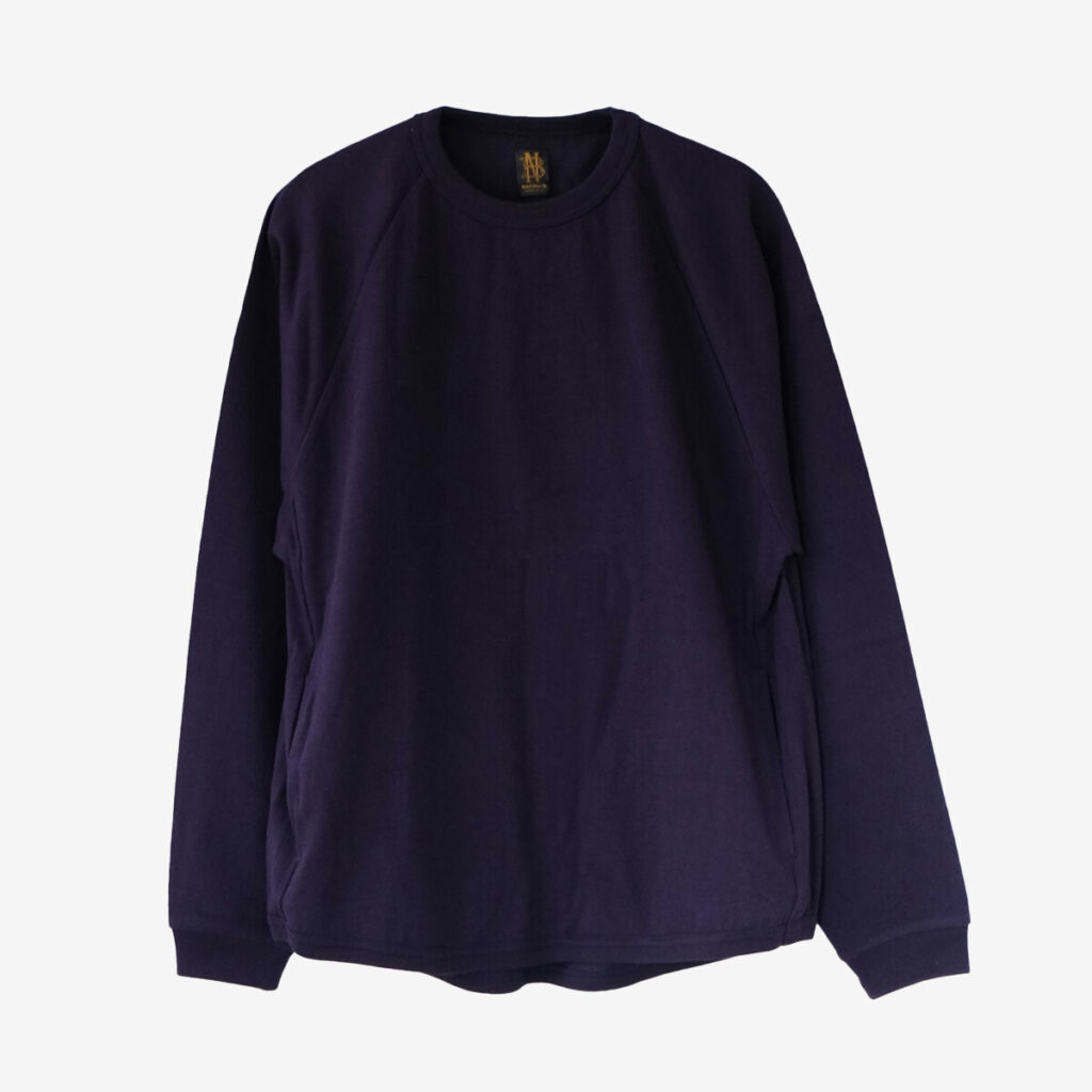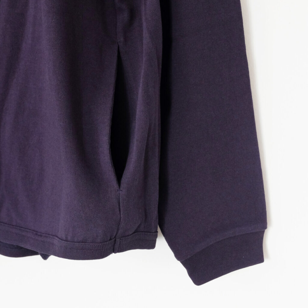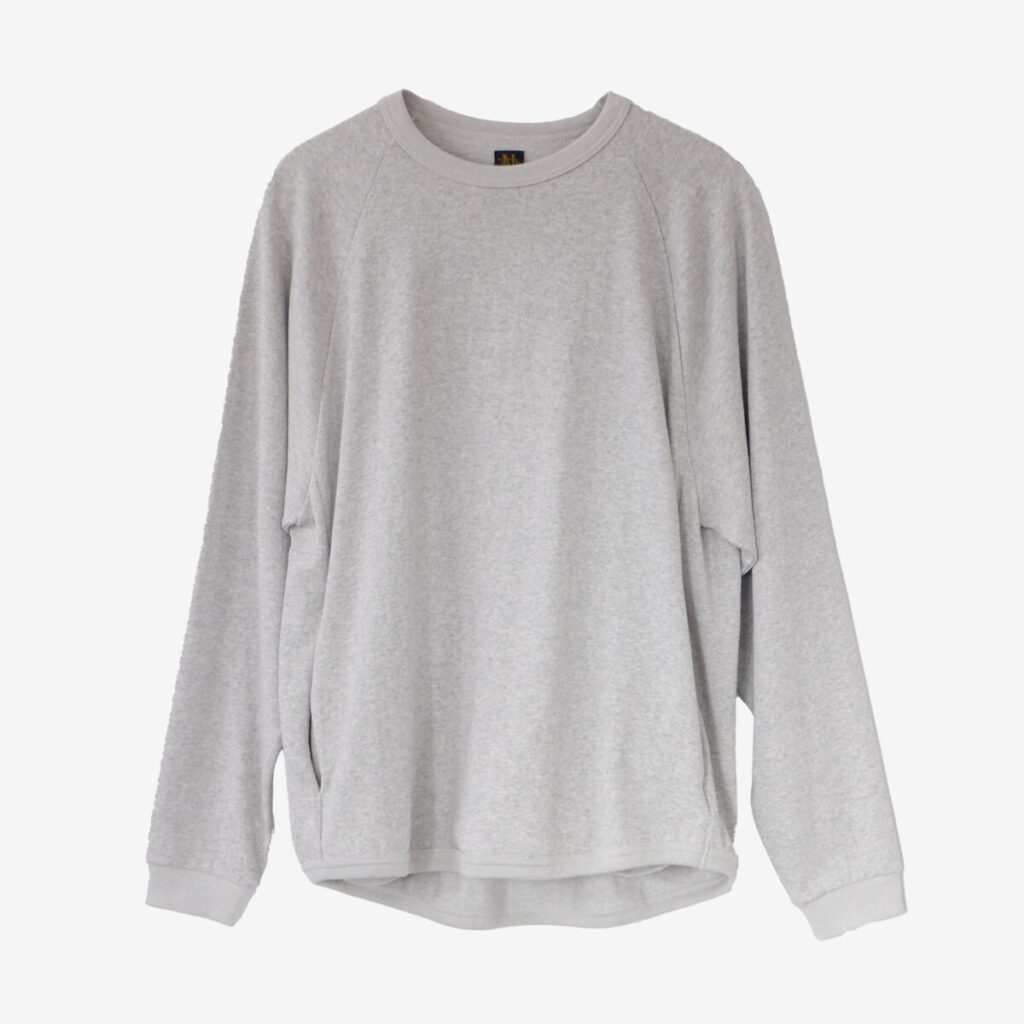 ゆとりあるラグランスリーブのシルエットに、前後差をつけた着丈。袖口と裾にはフライスを施し、サイドポケットも備えて実用性もプラス。ドライな質感とリラックス感のあるフォルムで、幅広いスタイルに馴染む一着です。