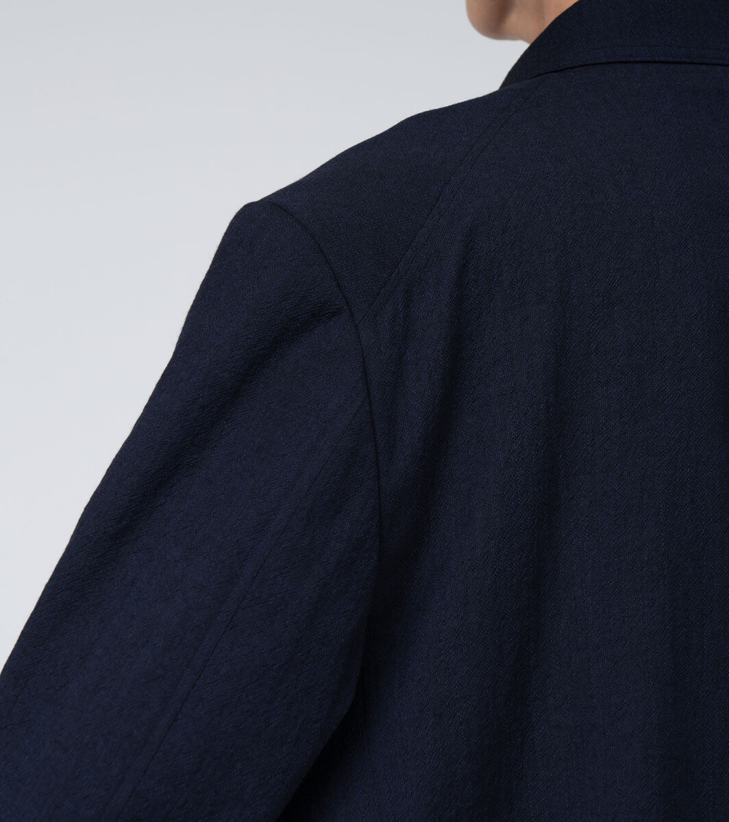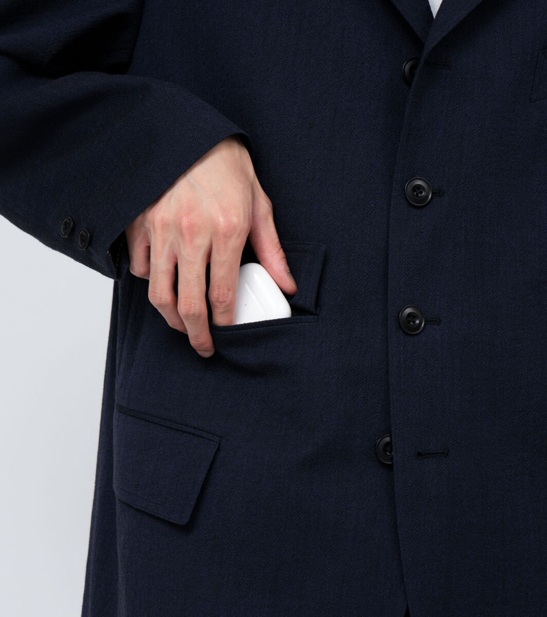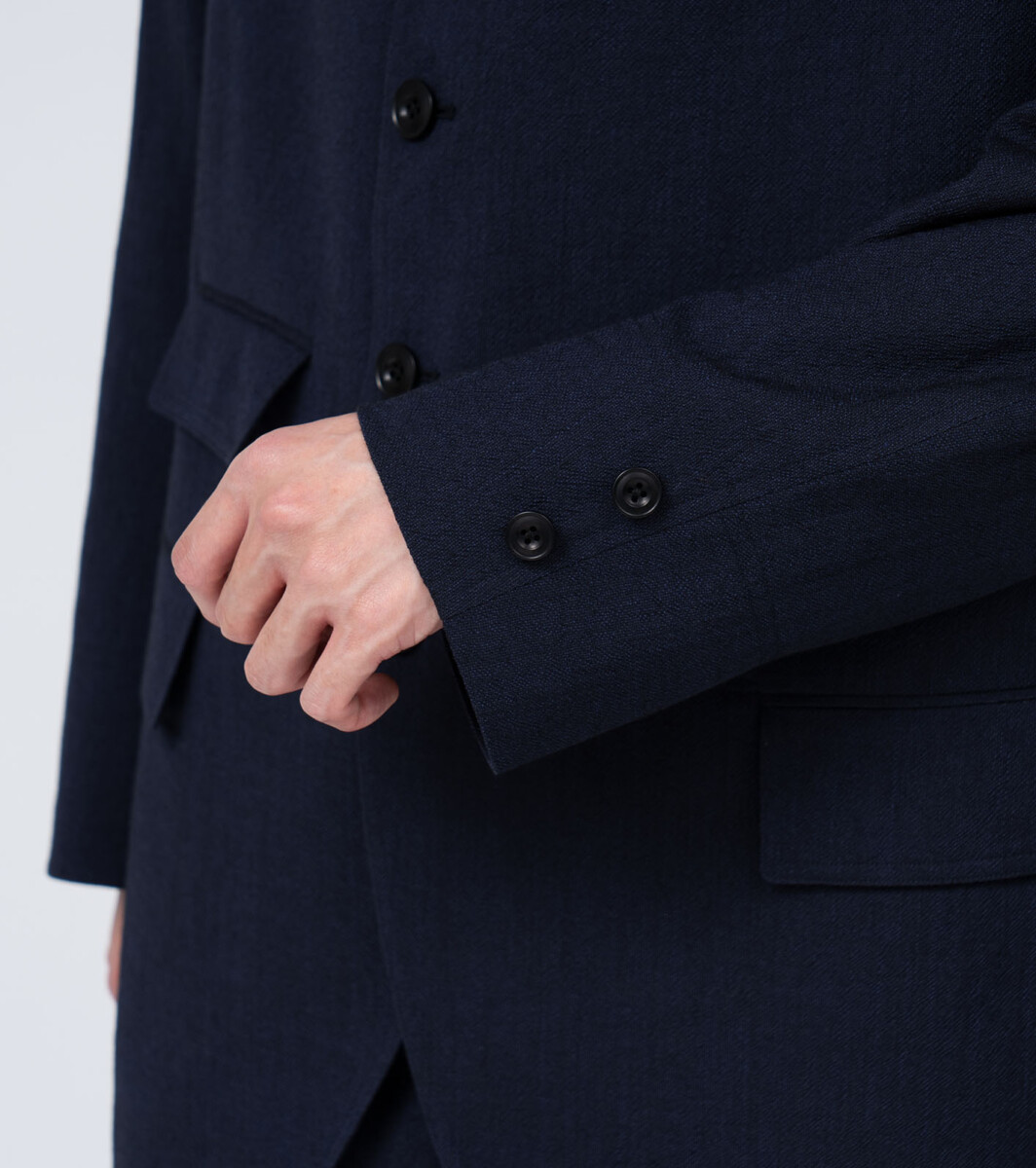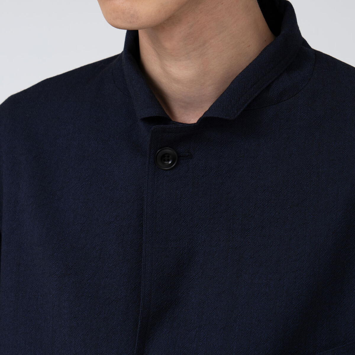 40年代のフレンチヴィンテージをデザインベースにしたサックコート。表地には、撚りを強めにかけたウールとリサイクルポリエステル/オーガニックコットンを交織し、洗いをかけることによって凹凸感を表現したクレープ素材を使用。軽やかな印象の生成りとストライプの裏地がポイント。