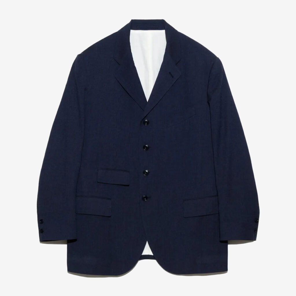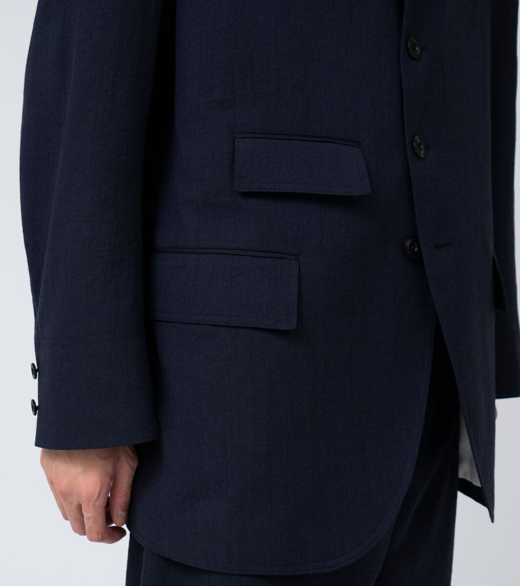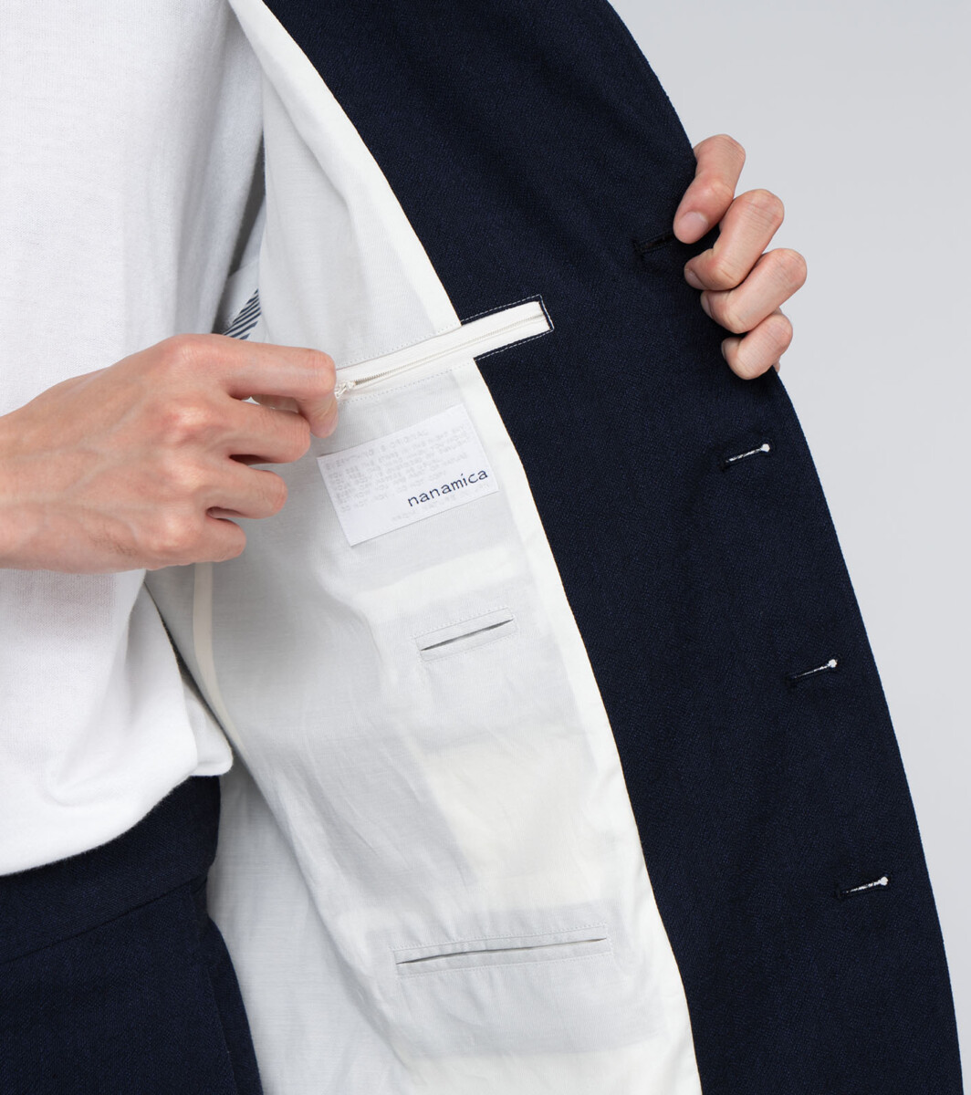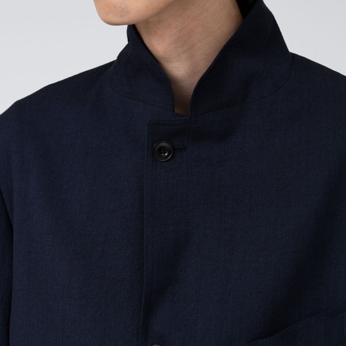 40年代のフレンチヴィンテージをデザインベースにしたサックコート。表地には、撚りを強めにかけたウールとリサイクルポリエステル/オーガニックコットンを交織し、洗いをかけることによって凹凸感を表現したクレープ素材を使用。軽やかな印象の生成りとストライプの裏地がポイント。