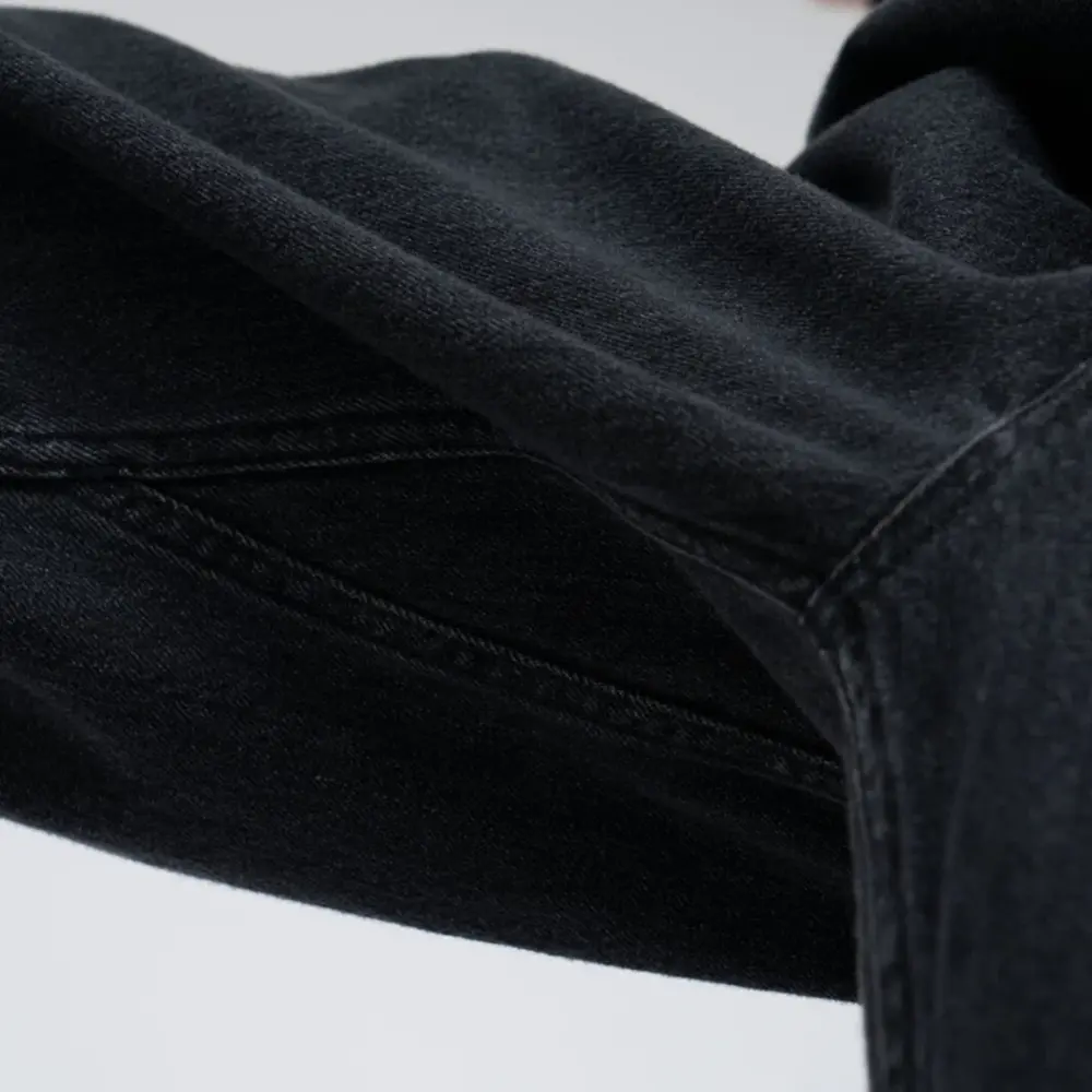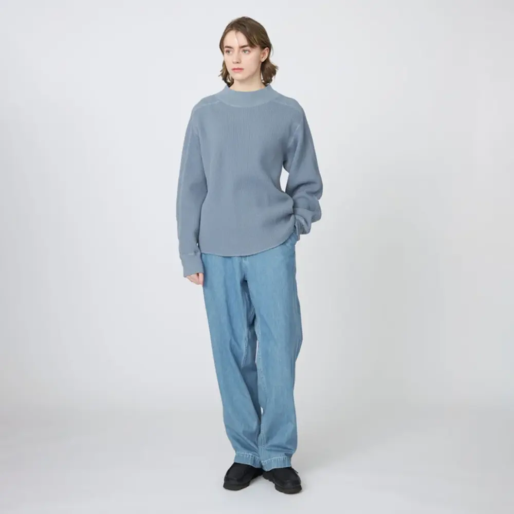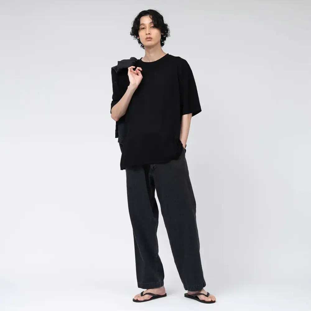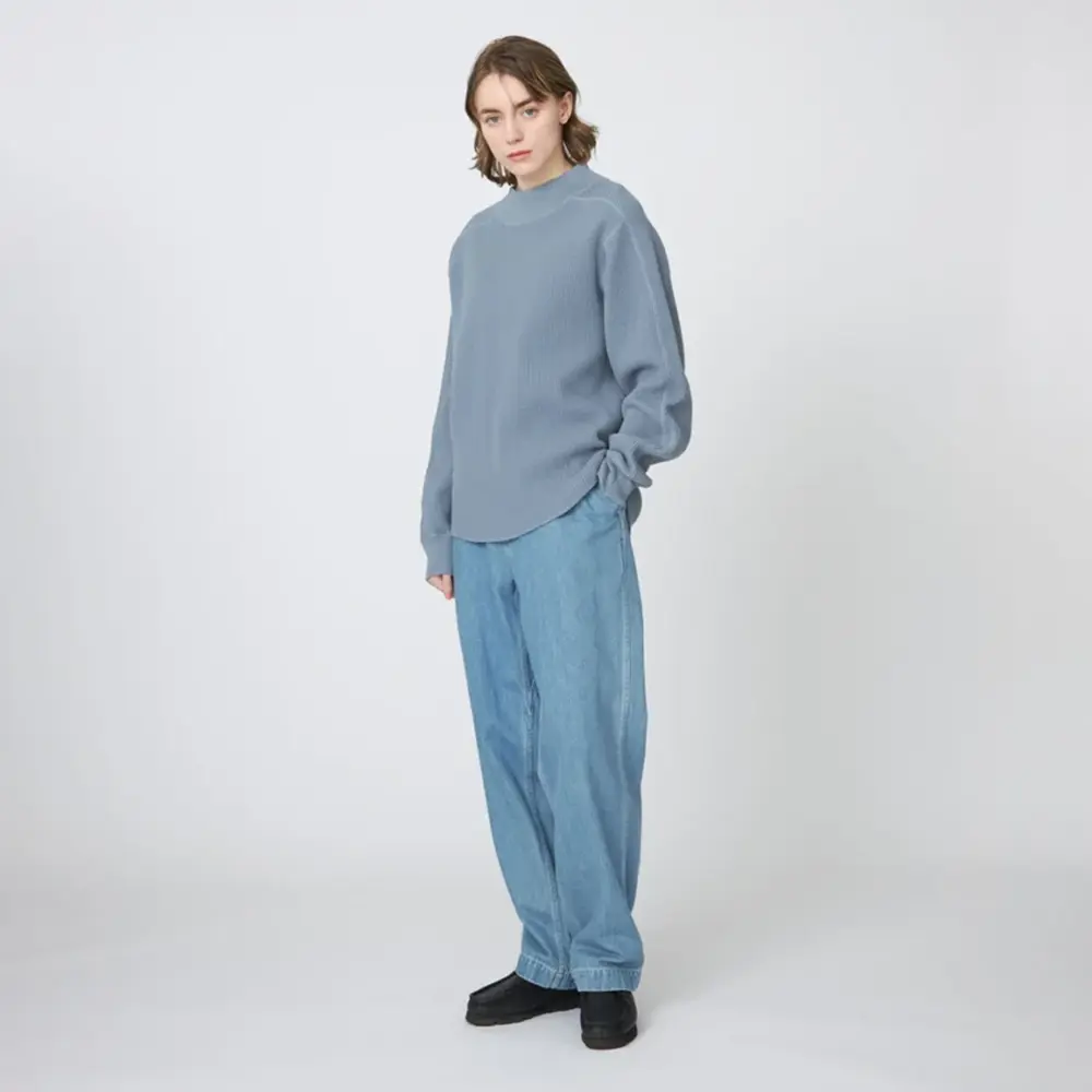 リサイクルポリエステルの外側をコットンで覆った太番手のムラ糸を独自開発し、ロープ染色によって仕上げたnanamicaオリジナルのハイブリッドデニムを使用。軽量で乾きやすく、耐久性と自然な経年変化を両立。股下には可動域を広げるマチを施し、後ポケットは隠しドットボタン仕様。フロントはファスナー開きで、ヴィンテージ感ある風合いに仕上げられています。