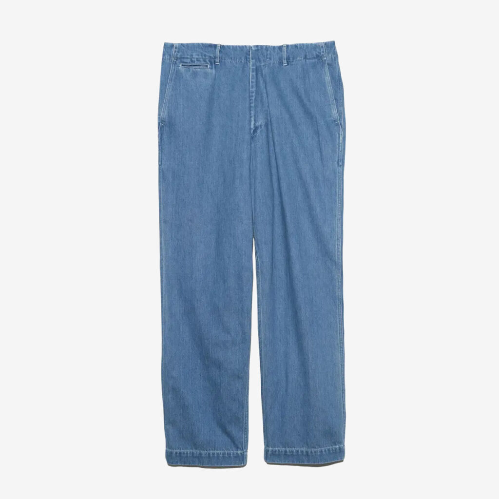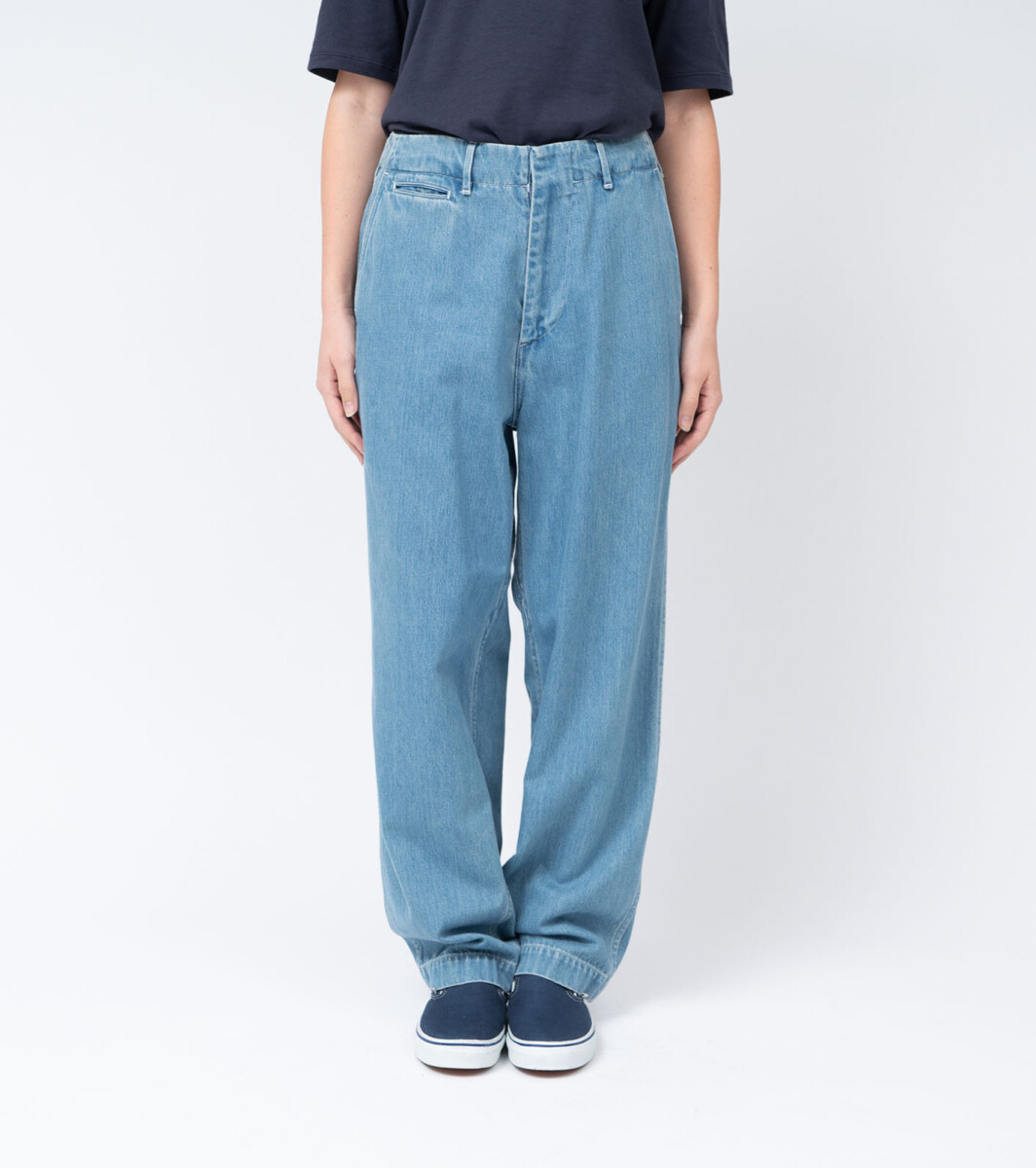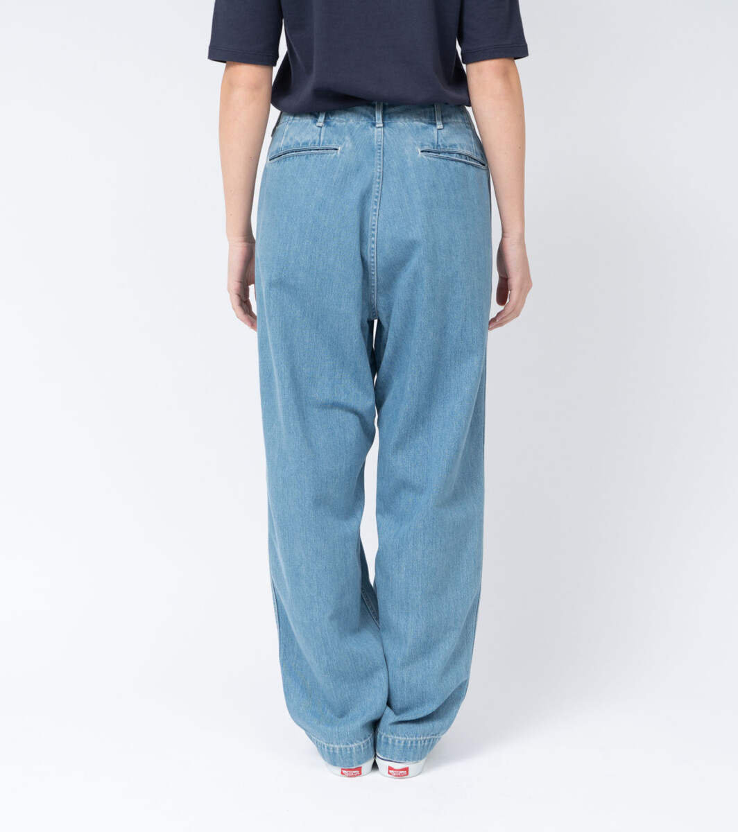 ワイドテーパードカットのデニムパンツ。リサイクルポリエステルの外側をコットンで覆った太番手のムラ糸を独自で開発し、ロープ染色にて染色しています。軽量且つ耐久性があり乾きやすいという機能性がありながら、自然な経年変化を楽しめるnanamicaオリジナルのハイブリッドデニム。