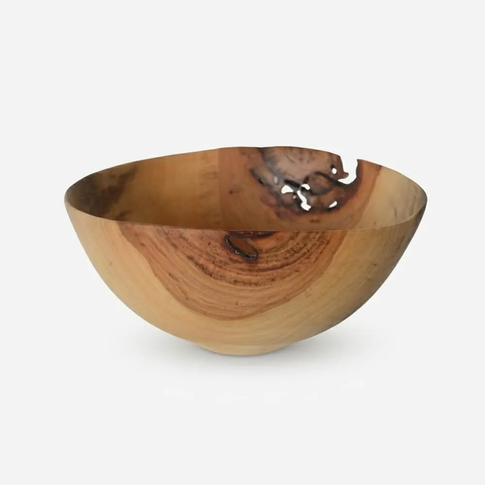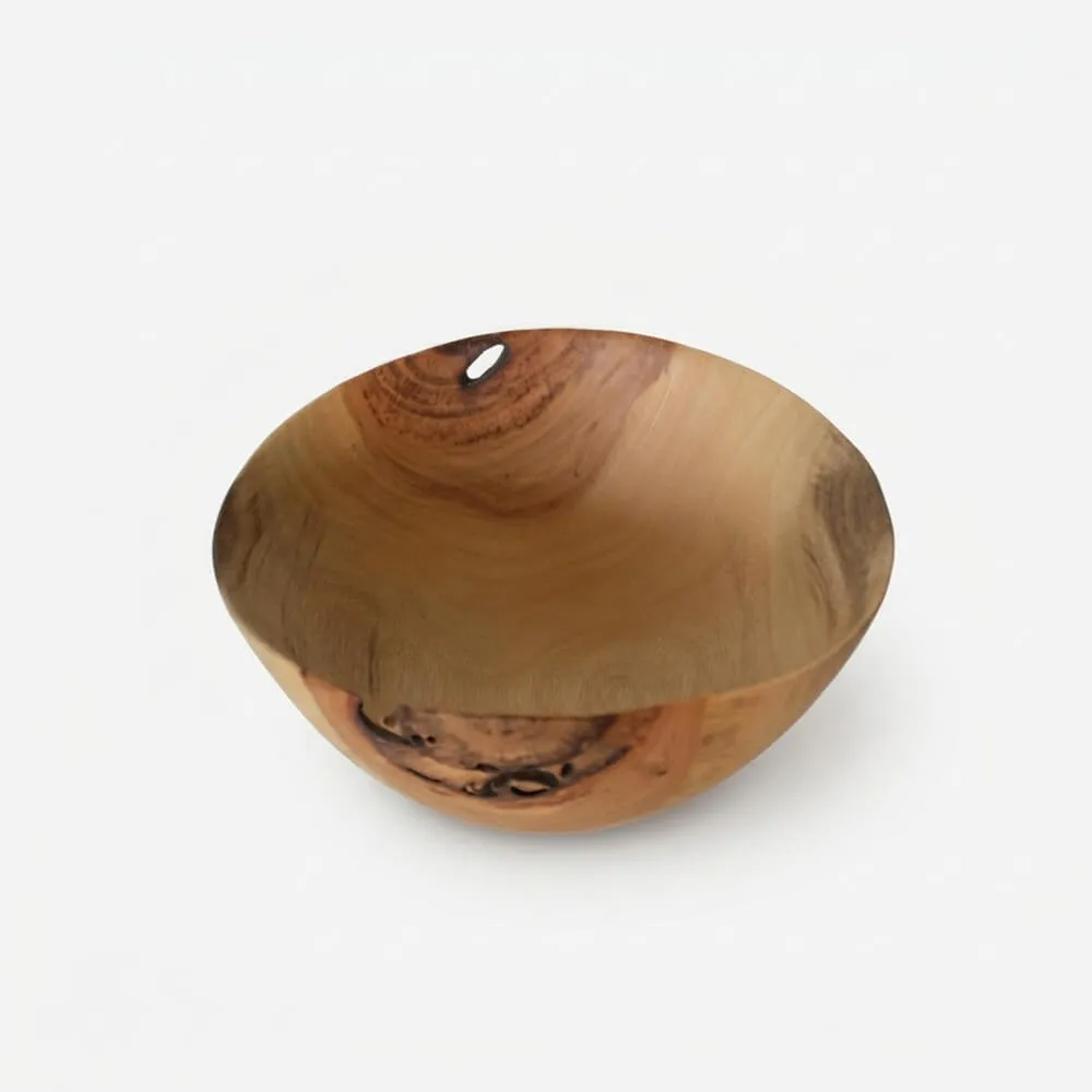 タブノキ材を使用し、自然が生んだ「割れ」や「穴」をあえて残して仕上げた唯一無二のウッドボウルです。タブノキは古来より「霊(たま)の木」とも呼ばれ、神社の境内などでも大切に育てられてきた縁起の良い銘木。その力強い木目と、時の経過を感じさせる天然の空洞(ウロ)や欠けをあえて活かし、芸術的な一品に仕上げました。タブノキ特有の赤みを帯びた褐色と、緻密で美しい木目が特徴。使い込むほどに艶が増し、さらに味わい深いヴィンテージ感へと育っていきます。