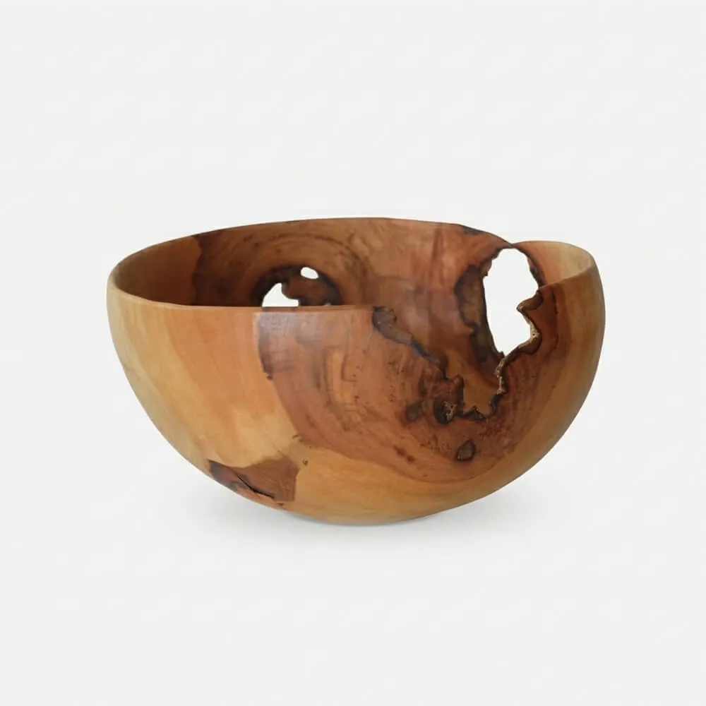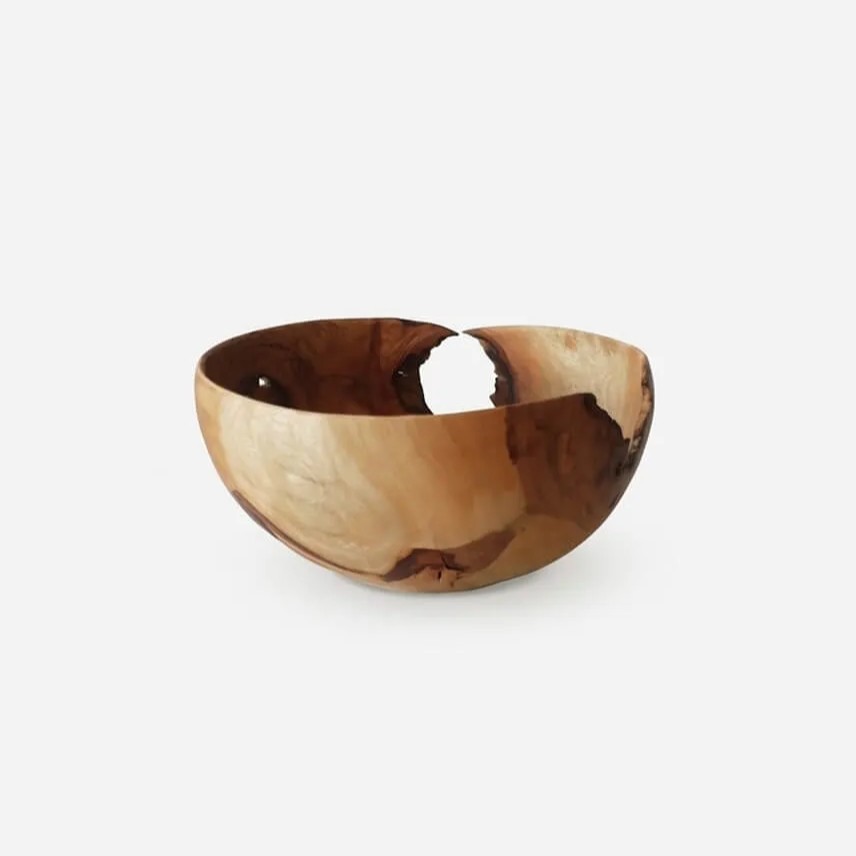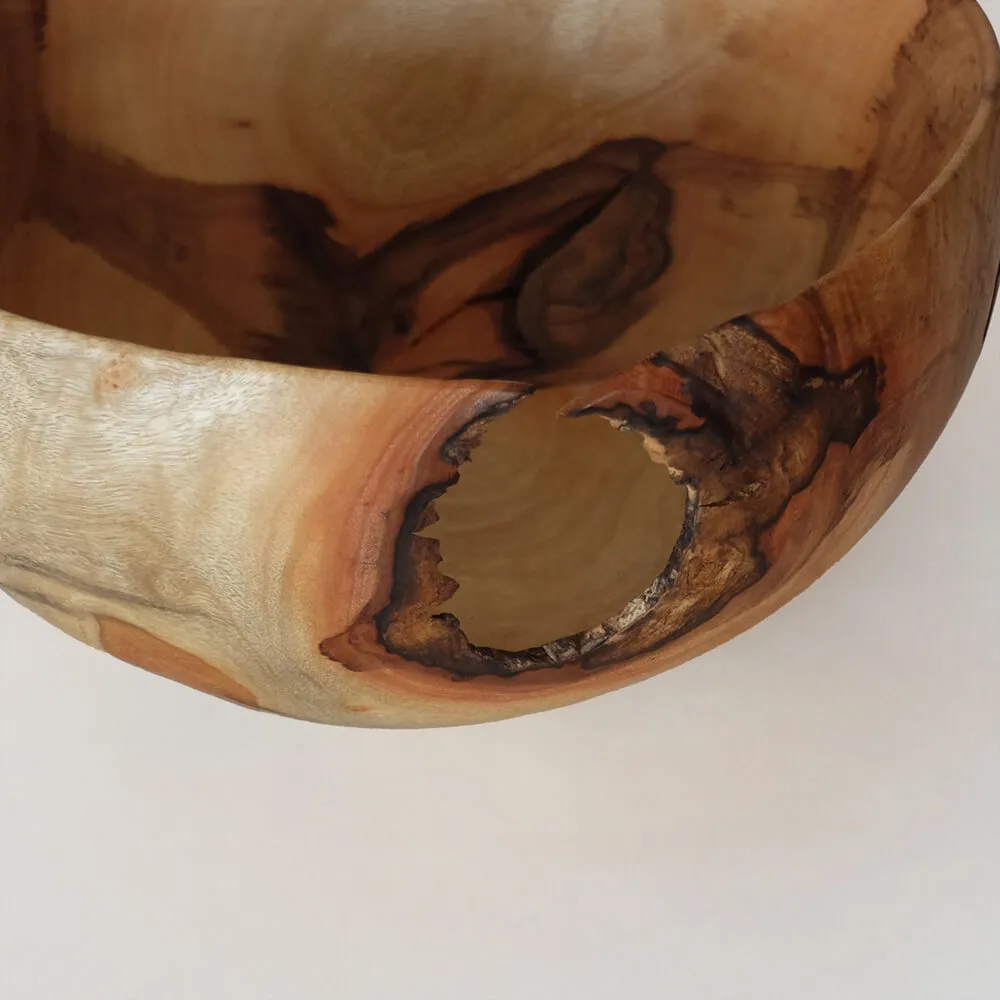 タブノキ材を使用し、自然が生んだ「割れ」や「穴」をあえて残して仕上げた唯一無二のウッドボウルです。タブノキは古来より「霊(たま)の木」とも呼ばれ、神社の境内などでも大切に育てられてきた縁起の良い銘木。その力強い木目と、時の経過を感じさせる天然の空洞(ウロ)や欠けをあえて活かし、芸術的な一品に仕上げました。タブノキ特有の赤みを帯びた褐色と、緻密で美しい木目が特徴。使い込むほどに艶が増し、さらに味わい深いヴィンテージ感へと育っていきます。
