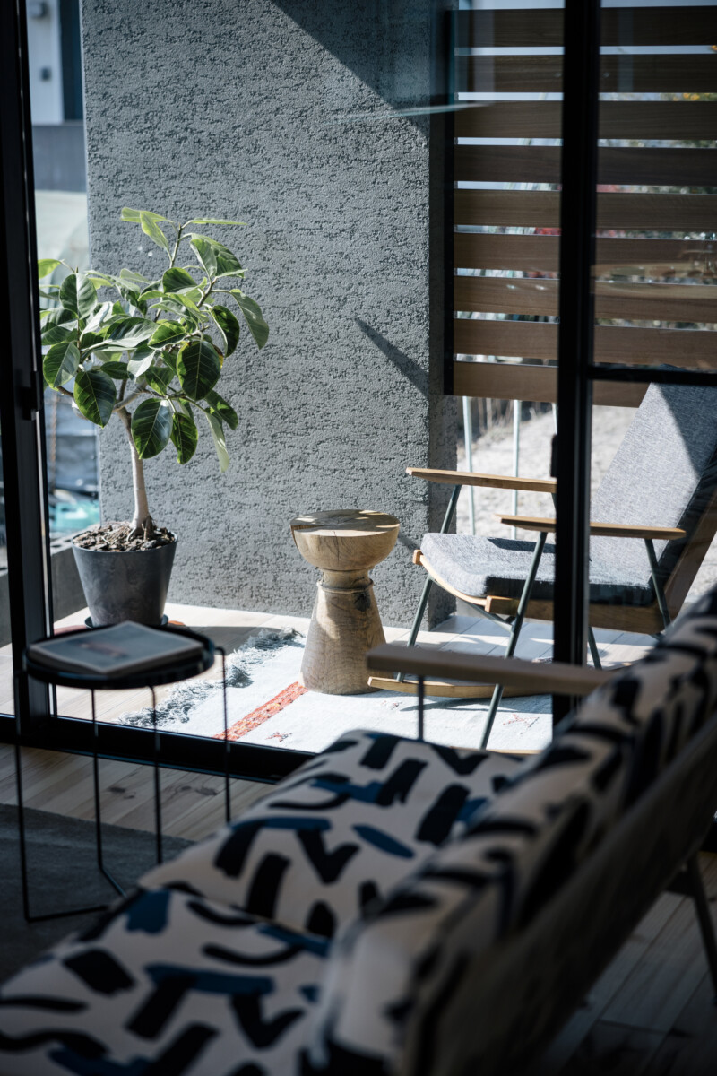 「限られた広さでゆとりのある暮らし」がこの家づくりのテーマ。最大限の建築面積で車2台の駐車スペースと、十分な居住空間の確保が課題であった。そのため外観は軒の無い「箱」のようなフォルムに。また、ご近所同士が密集している環境のため、窓の位置を高く配することで、プライバシー保護にも配慮している。LDKの西側に位置する掃き出し窓の先に板塀付きのテラスを設け、人目を気にすることのないくつろぎの空間に。リビング脇の階段を上がると主寝室・ウォークインクローゼット・子供部屋といったプライベートスペースへ繋がっている。そのことによりLDKは家族が集うハブとしても機能している。限りある広さを「狭い」と捉えることなく、「身近」「ミニマムかつシンプル」「効率的」という視点で設計されたこの住まいは、最大限に引き出された心地よさを感じるものとなった。